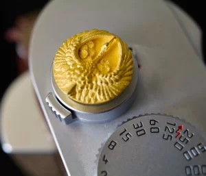 (1)Using wax carving the Phoenix hot shoe cover (2)casting Phoenix through the process of lost wax casting (3)Graving many times